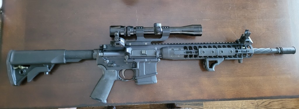 Bret added canted BUIS paired with a 3-9x variable scope. Normally a thirty round magazine is in place of the ten round one. Dummy cord front and back sling mounts for quiet sling contacts.