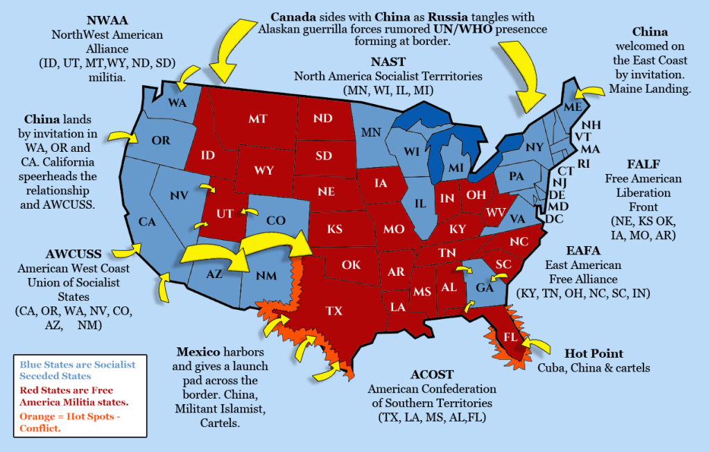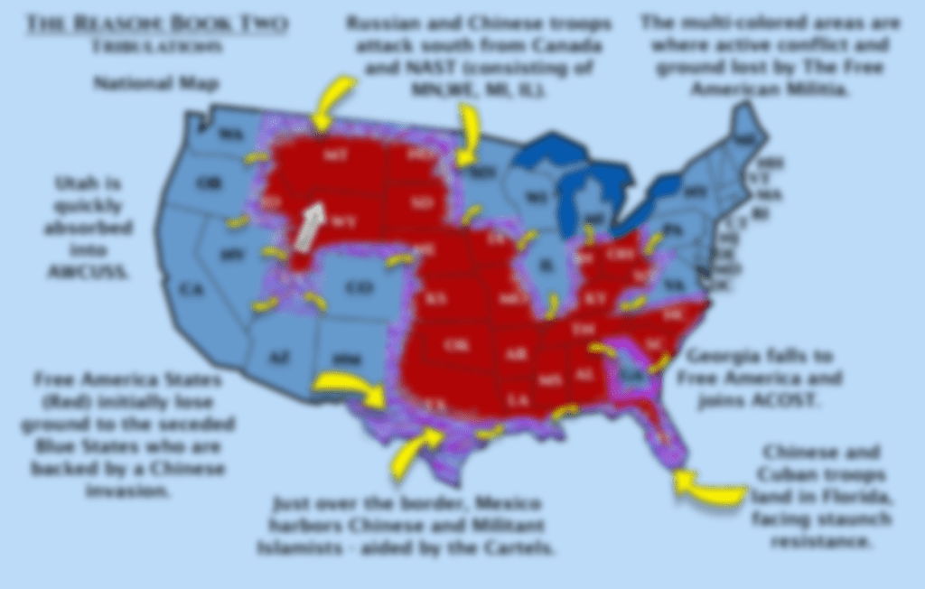 The Red states are those states that have stayed true to the Constitutional Republic idea. They have four groups of states that also include Militia groups that have been organized and lead by a mysterious person going by the call sign Leonidas. There’s a fifth militia that is mobile and can moved anywhere available in a moments notice.