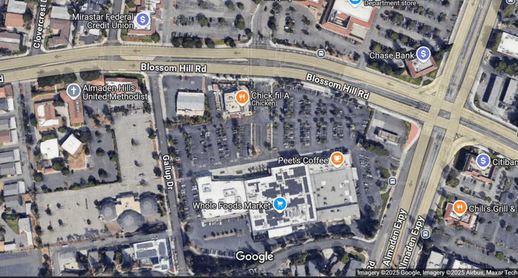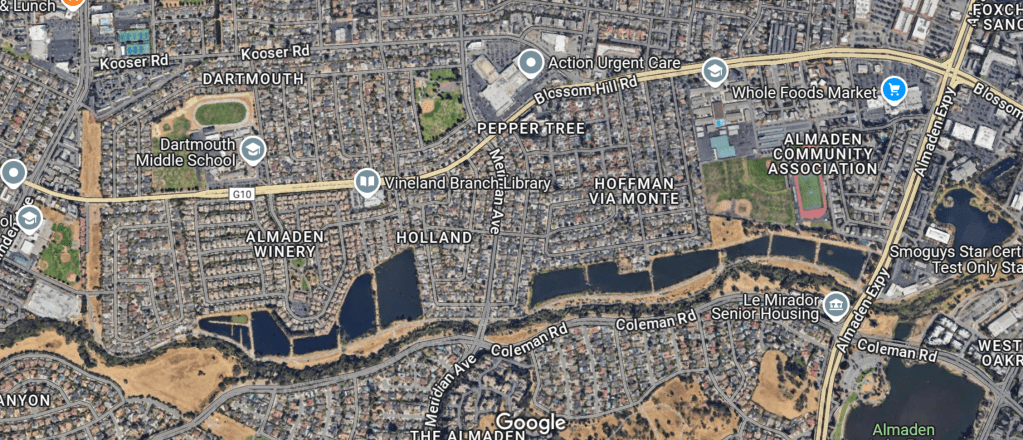 Jen’s neighborhood in California. You can see the whole food mkt at the top right where her uber tries a detour to escape the Chinese roadblock. Then you can follow her south, where she takes a pedestrian trail along those bodies of water to her rental house. Book one Chapter 4.